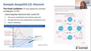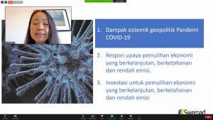 Diskusi dibuka dengan pemaparan dari Dr. Phillia Restiani dengan tiga poin utama, yaitu dampak sistemik geopolitik pandemik Covid-19 secara global (meliputi dampak sosial kesehatan, politik domestik, potensi IPTEK dan SDM, lingkungan, dan lain-lain), respon upaya pemulihan ekonomi yang berkelanjutan, berketahanan, dan rendah emisi, serta bagaimana investasi untuk pemulihan ekonomi yang berkelanjutan, berketahanan, dan rendah emisi dapat dilakukan.